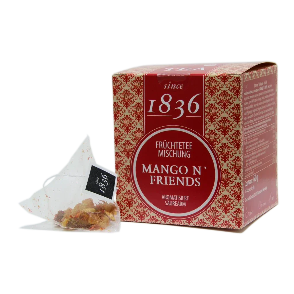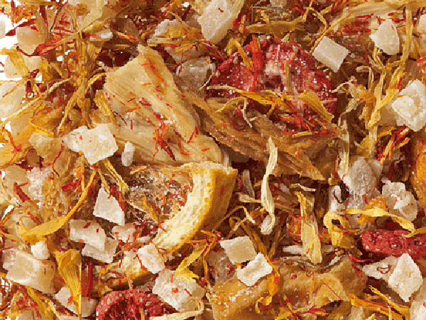 Aromatizzato, poco acido, nota aromatica: mango Ingredienti: cubetti di ananas (ananas, zucchero), cubetti di mango (mango, zucchero), scorze di arancia, aromi, liofilizzati. Pezzetti di mandarino, cartamo, liofilizzati Pezzi di fragola, fiori di calendula Un tè alla frutta della classe extra! Scaglie extra grandi e cubetti di succosi frutti esclusivamente esotici formano questa base a bassa acidità. Il gusto tipico, già affinato da questi ingredienti di frutta, è meravigliosamente completato da una speciale combinazione di aromi dolci e freschi. Come tè freddo, è una vera delizia che mette in ombra molte bevande a base di succo.
