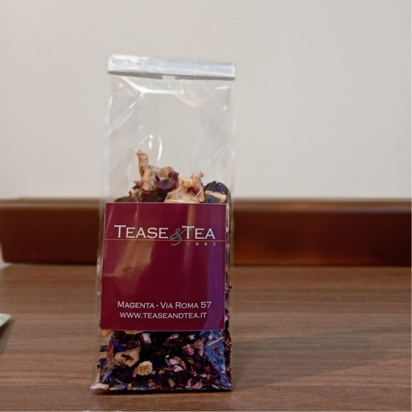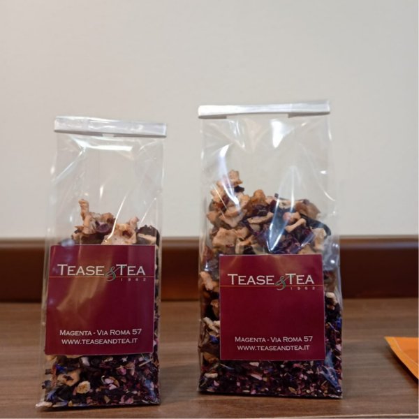 Pezzetti di mela, pezzetti di mela acidificati (mela, acidificante: acido citrico), scaglie di carote, aroma naturale, rosa canina, scorza d'arancia, spicchi di mandarino, foglie dolci di mora, citronella, cartamo, petali di rosa cremisi.