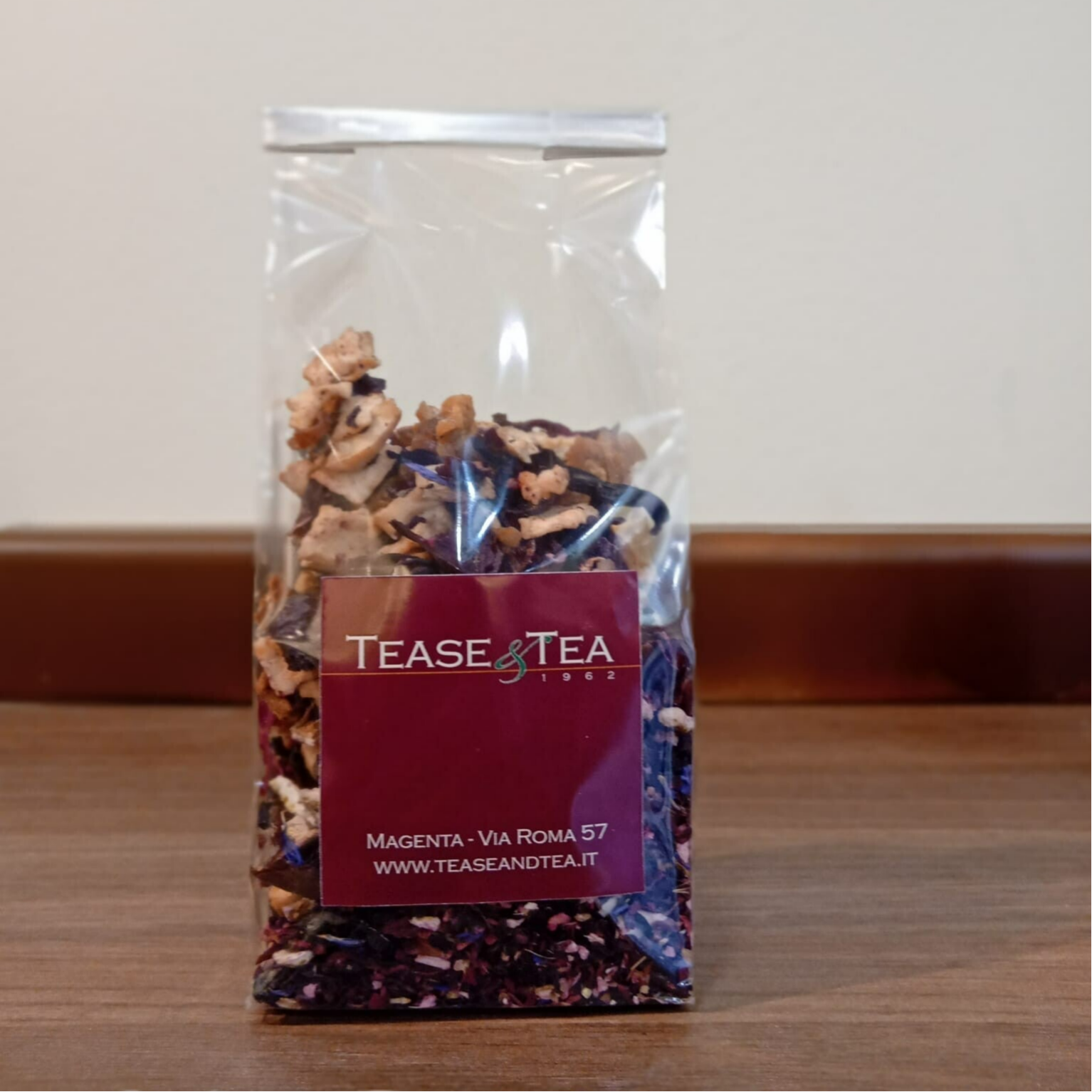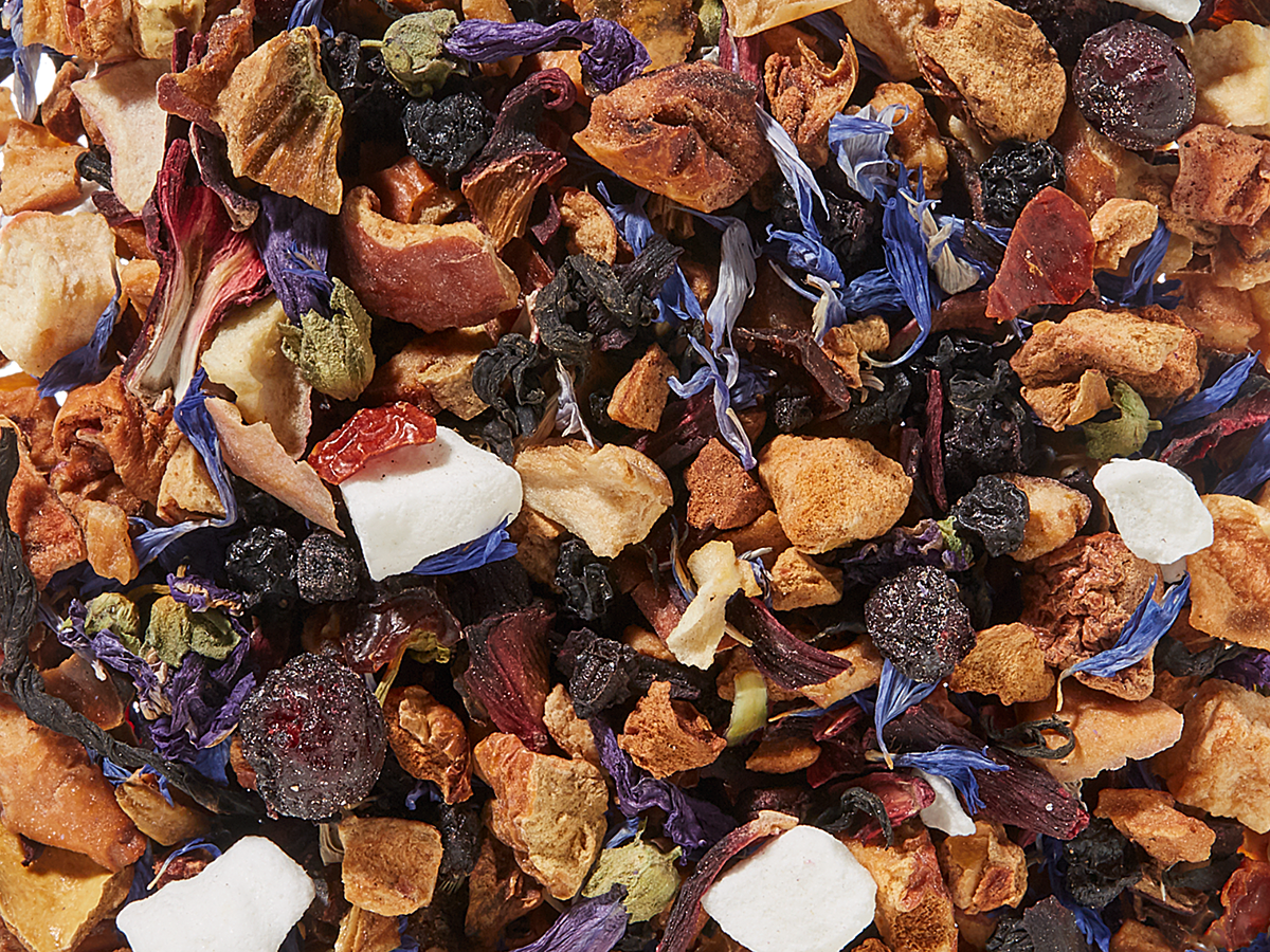 pezzetti di mela, petali di ibisco, coccole di sambuco, rosa canina, cubetti di mela, aroma naturale, foglie di mirtillo montano, mirtilli, granulato di jogurt liofilizzato (jogurt magro, zucchero, maltodestrina, amido modificato, acidificante: acido citrico), mirtilli liofilizzati, fiordalisi, fiori di malva.