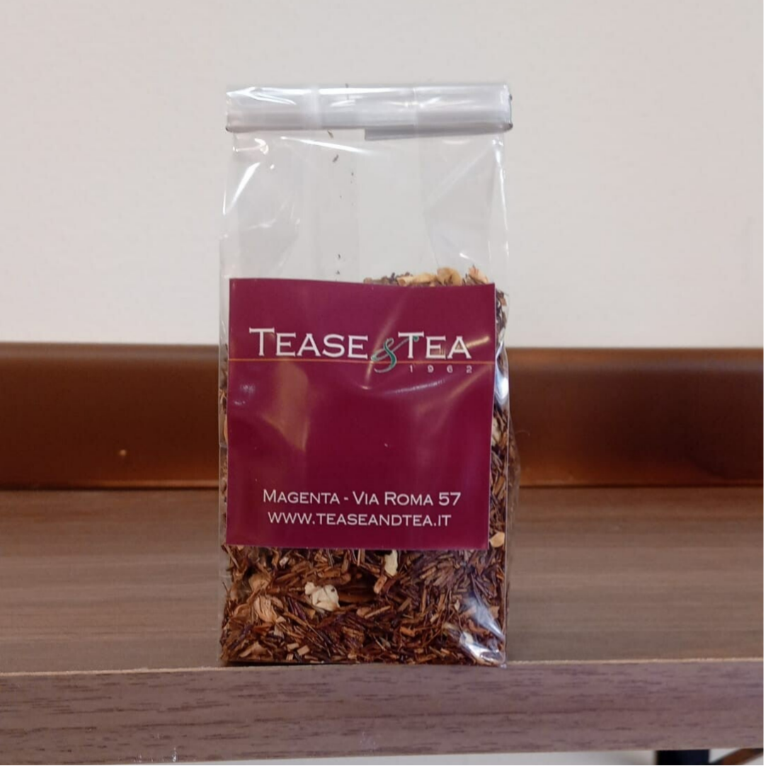 Rooibos, pezzetti di mela, cocco grattuggiato, scorza di limone, foglie dolci di mora, aroma, pezzetti di pesca liofilizzata (pesca, zucchero), scorze di limone liofilizzate, petali di girasole