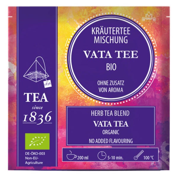 4 bustine di tisana Vata : pezzetti di cannella*, pezzetti di zenzero*, semi di finocchio*, cardamomo intero*, radice di liquirizia*, scorze di limone*.