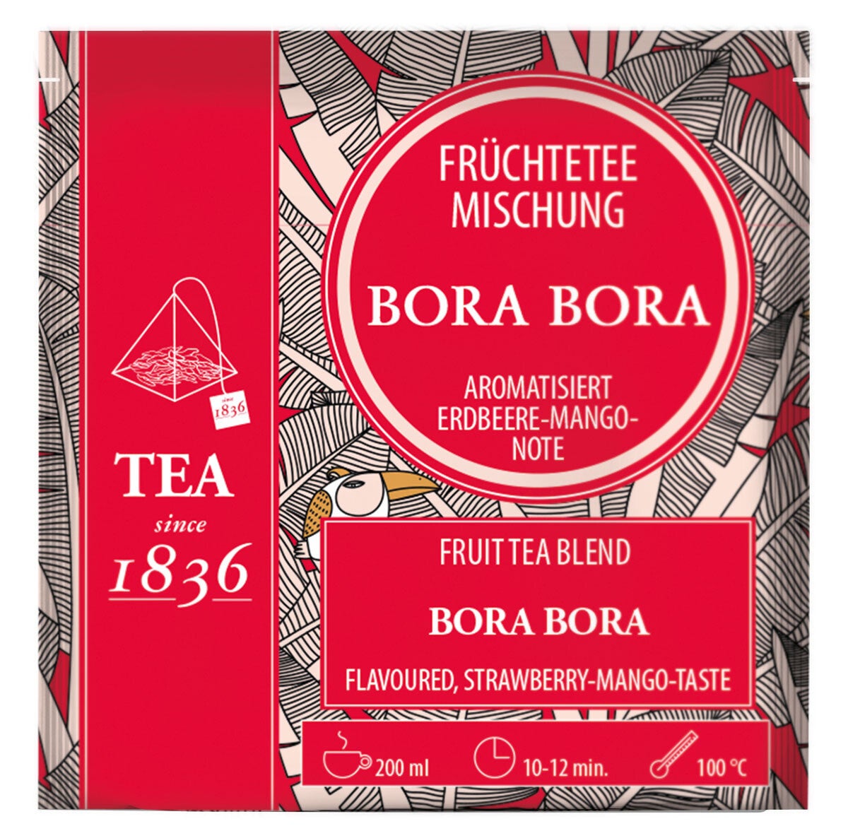 4 bustiene di infuso Bora Bora :petali di ibisco, pezzetti di mela, cubetti di papaya (papaya, zucchero), uva secca di Corinto, coccole di sambuco, ribes nero, aroma, pezzetti di lampone liofilizzati, pezzetti di fragola liofilizzata, petali di girasole, petali di fiordaliso azzurro.