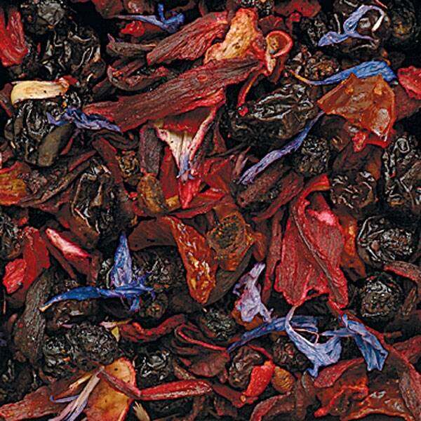 Karkadè, rosa canina, uvetta, aronia bacche, sambuco bacche, mirtillo bacche, aromi, aroma lampone 1%, aroma ciliegia 0,5%, fiordaliso petali