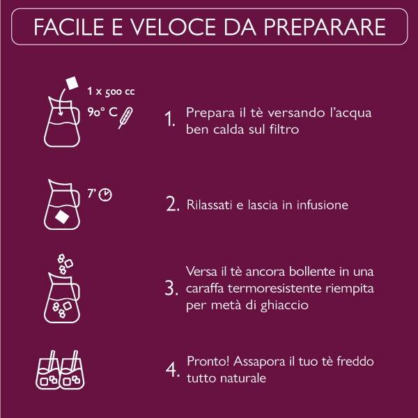Versare il tè ancora caldo in una caraffa riempita per metà di ghiaccio. La preparazione è facile e veloce e ogni bustina contiene la quantità perfetta per ottenere 1 litro di delizioso tè freddo, ricco di gusto e profumo. Dolcifica a piacere, aggiungi limone, menta o frutta fresca per esaltare il gusto e scopri le nostre ricette per mocktail e cocktail rinfrescanti ed unici.